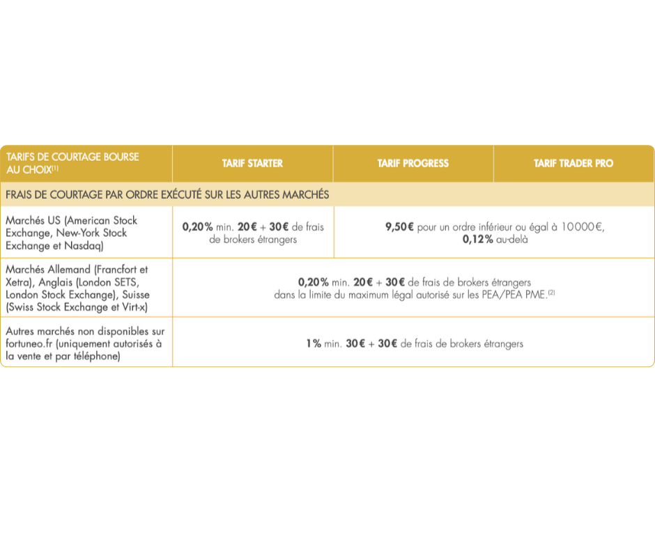 Pour les places boursières étrangères, Fortuneo applique des frais de courtage légèrement plus élevés comme indiqué dans le tableau ci-dessous. Toutefois, ces frais restent plafonnés grâce à la loi PACTE.