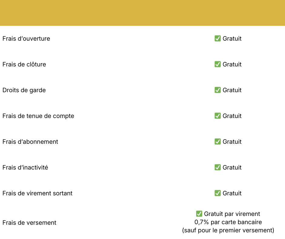 ✅ En matière de frais, le PEA de Trade Republic fait clairement partie (si ce n’est le) des PEA les moins chers du marché aujourd’hui. La tarification est ultra simple et pour aller encore plus loin, aucun frais de transaction n’est appliqué lorsque vous investissez via un plan d’épargne. La seule chose à avoir en tête concerne l’alimentation du compte : si vous effectuez un dépôt par carte bancaire, des frais de 0,7 % s’appliquent. En dehors de ce point précis, la grille tarifaire du PEA de Trade Republic est, selon moi, l’une des plus simples et des plus agressives du marché.