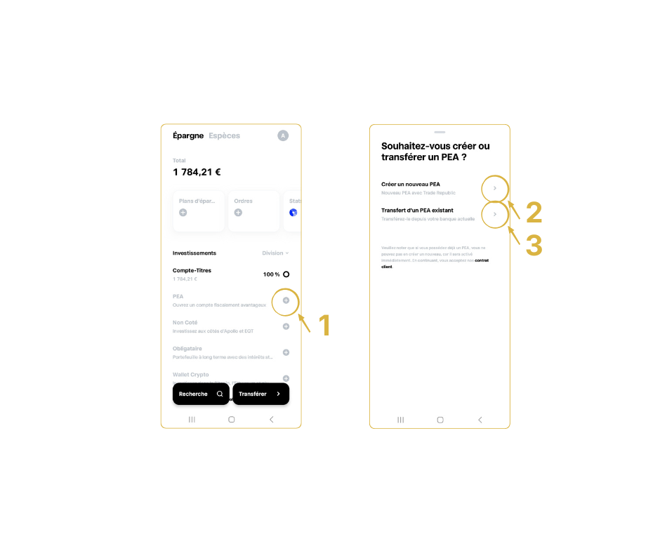 ✅ L’ouverture d’un PEA chez Trade Republic se fait de manière simple, rapide et entièrement en ligne. Que vous souhaitiez ouvrir un nouveau PEA ou transférer un PEA existant, les démarches sont guidées pas à pas depuis l’application.