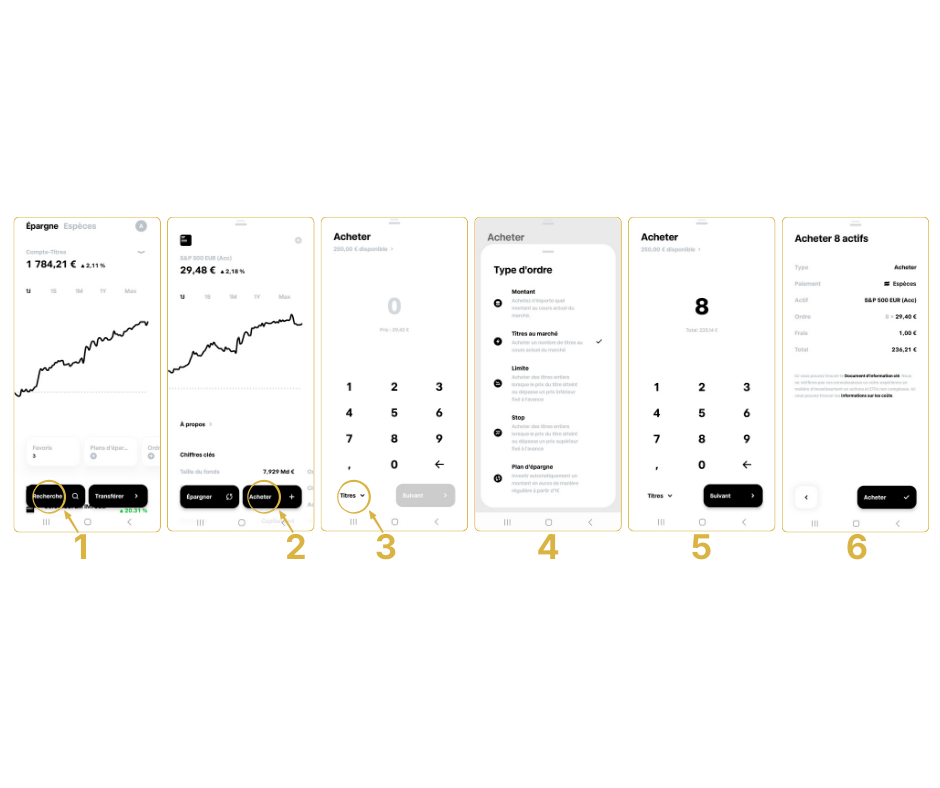 Voici maintenant les étapes à suivre pour réaliser un ordre d’achat sur l’application mobile Trade Republic :