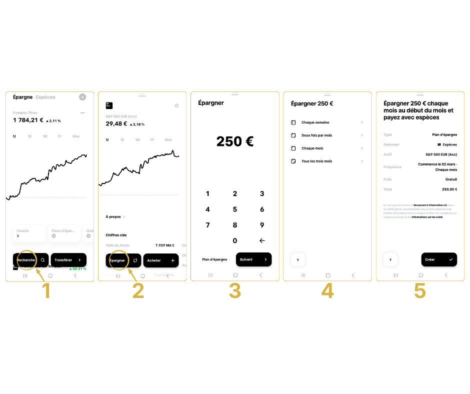 Vous pouvez mettre en place un plan d’épargne afin d’investir automatiquement, à intervalles réguliers, une somme fixe dès 1 € sur des ETF ou des actions. Vous avez le choix de la fréquence entre chaque semaine, tous les 15 jours, tous les mois ou tous les trois mois, selon ce qui vous convient le mieux. C’est une solution idéale pour mettre en place la stratégie Dollar Cost Averaging (DCA).