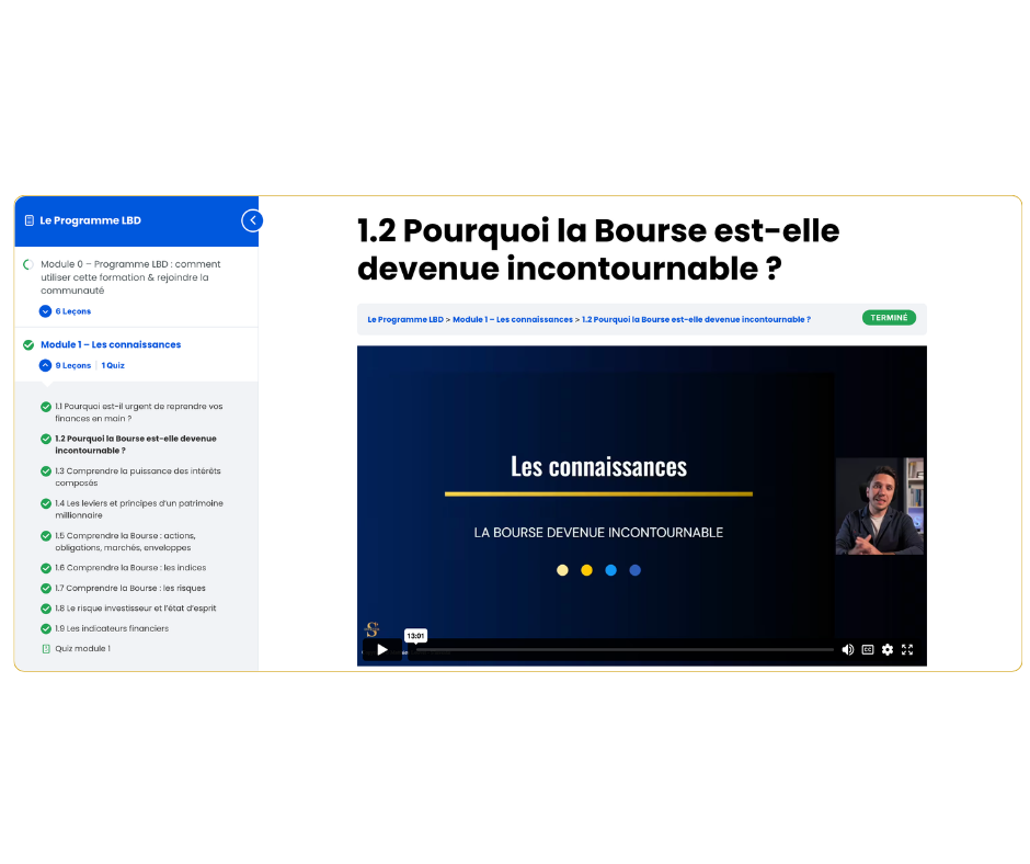Si vous n’avez jamais investi et que la Bourse vous paraît complexe, le programme LBD est justement conçu pour vous. Les premiers modules posent des bases solides puis la montée en compétences se fait progressivement :