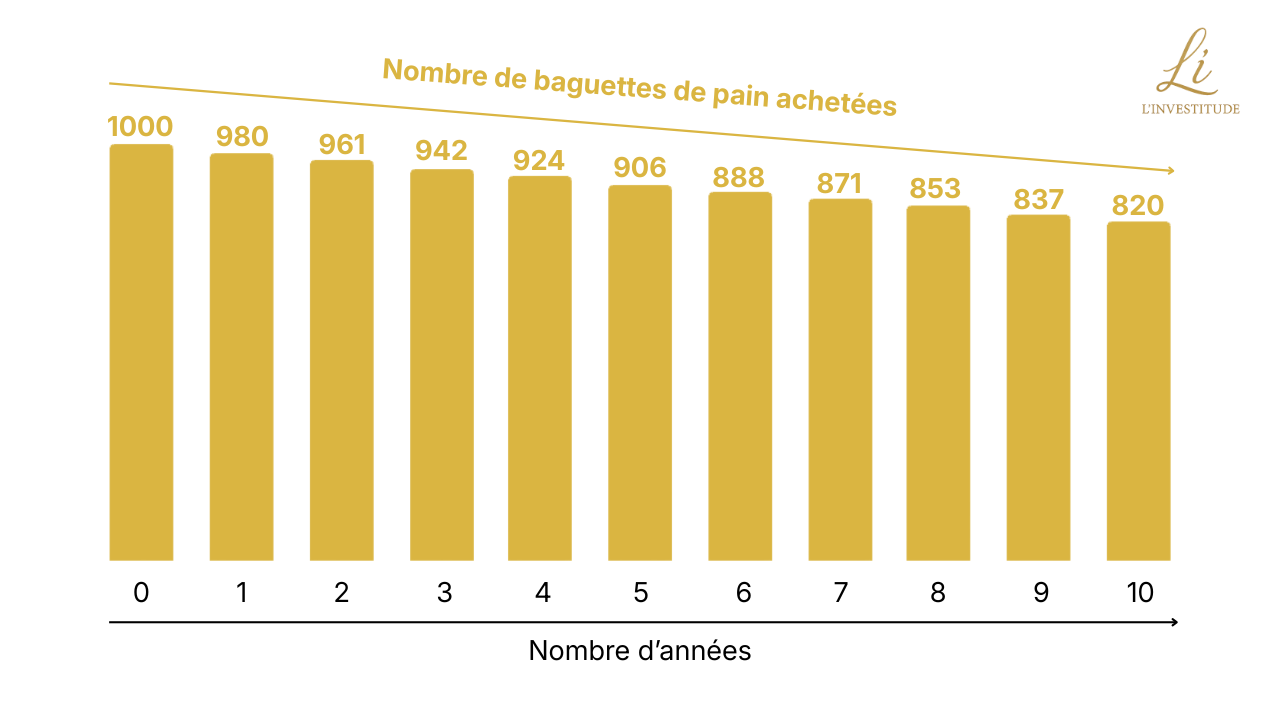 Prenons un exemple très simple pour illustrer l’impact de l’inflation sur votre épargne. Si aujourd’hui vous disposez de 1 000 €, vous pouvez acheter 1 000 baguettes de pain à 1 € l’unité. Si pendant un an l’inflation est de 2 %, le prix de la baguette augmente l’année suivante à 1,02 €. Avec vos 1 000 €, vous ne pourrez alors en acheter que 980. Si l’année suivante l’inflation reste à 2 %, le prix d’une baguette augmente encore à 1,04 €. Vos 1 000 € ne vous permettront plus d’en acheter que 961. Et ainsi, chaque année, votre argent perd progressivement du pouvoir d’achat. Au bout de 10 ans d’inflation à 2 %, une baguette coûte 1,22 €. Résultat : avec vos 1 000 €, vous ne pourrez plus acheter que 820 baguettes. Le pouvoir d’achat de vos 1 000 € a fondu de 180 baguettes simplement parce que vous ne les avez pas fait travailler pendant tout ce temps.