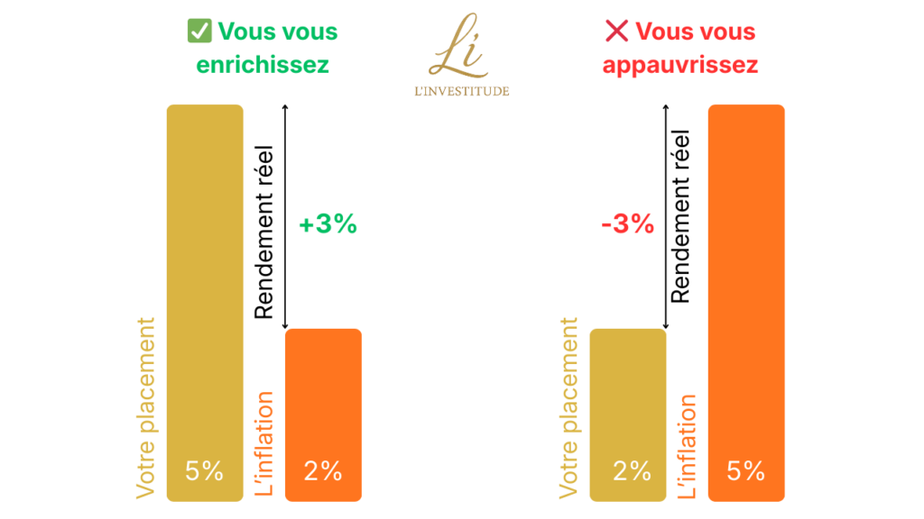 Retenez bien ce principe : votre rendement réel = rendement de votre placement – taux d’inflation.